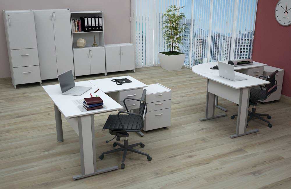 Como você pode ver na imagem abaixo, disponibiliza mesa reta simples (retangular), mesa em “L” bi-partida, mesa em L com conexão, gaveteiros fixos, gaveteiros volantes, armário baixo, armário executivo (estante aberta na parte superior e fechada na parte inferior – com chaves), armário alto fechado (do tipo diretor), armário com gavetões.