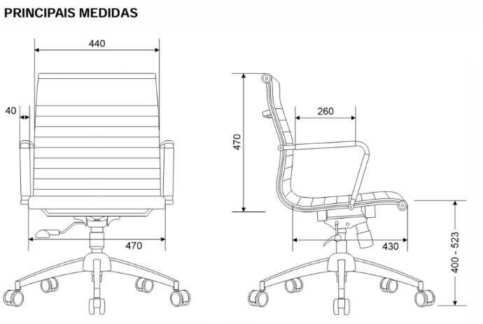 A silhueta esguia e as famosas costuras horizontais no revestimento em vinil preto conferem uma estética limpa e profissional. É a cadeira que comunica autoridade, seja na versão Presidente (encosto alto) ou Diretor (encosto médio).