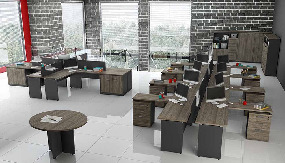 No caso das plataformas lineares, elas podem sem montadas apenas com mesas simples e painéis suspensos, ou com berço central para passagem de fiação e painéis suspensos ou ainda com régua de tomadas individuais e painéis suspensos, na versão mais completa e conectiva desse modelo. Você encontra nessa linha todos os opcionais como armários, gaveteiros fixos, volantes, mesas de reunião, balcão de atendimento.