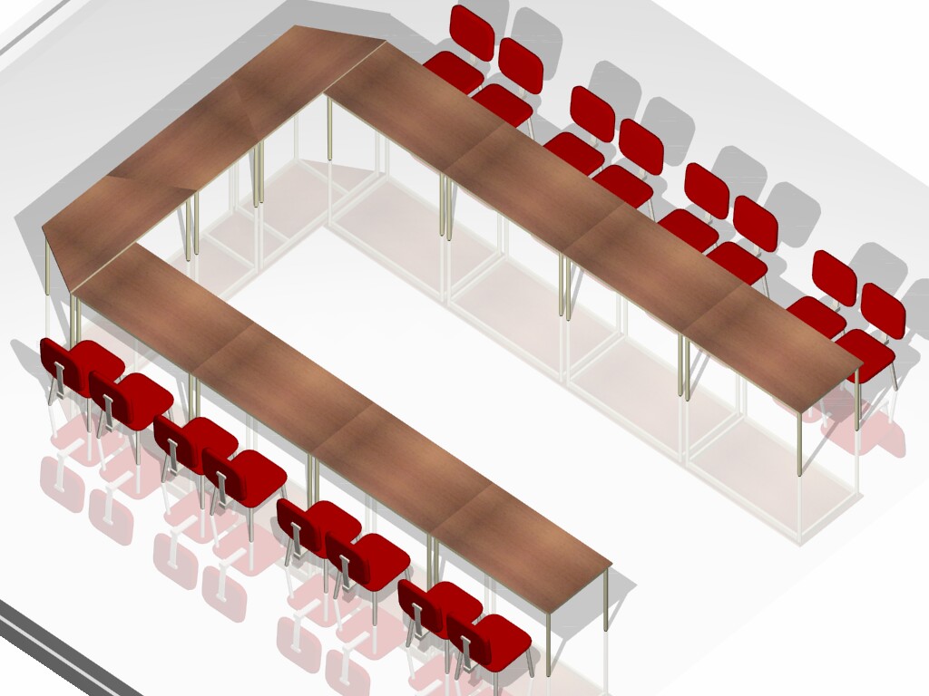Essa mesa para treinamento é formada por alguns módulos trapezoidais e outros retangulares, complementares. O desenho, o formato da mesa para treinamento, será decidido em função dos objetivos do cliente, da quantidade de pessoas prevista para serem recebidas e, principalmente, do tamanho do espaço, sendo necessário um lay-out, um projeto. Traga as medidas da sua sala e peça seu projeto aqui na Loja do Centro Móveis para Escritório!
