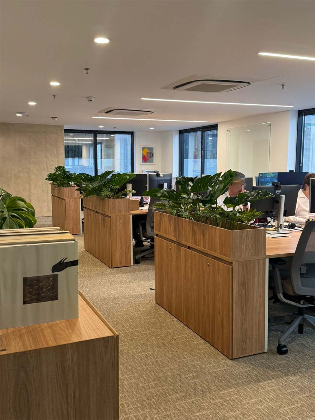 Projeto especial de sala operacional com Mesa Plataforma, armários de fechamento e cachepots ou floreiras para agência em São Paulo: